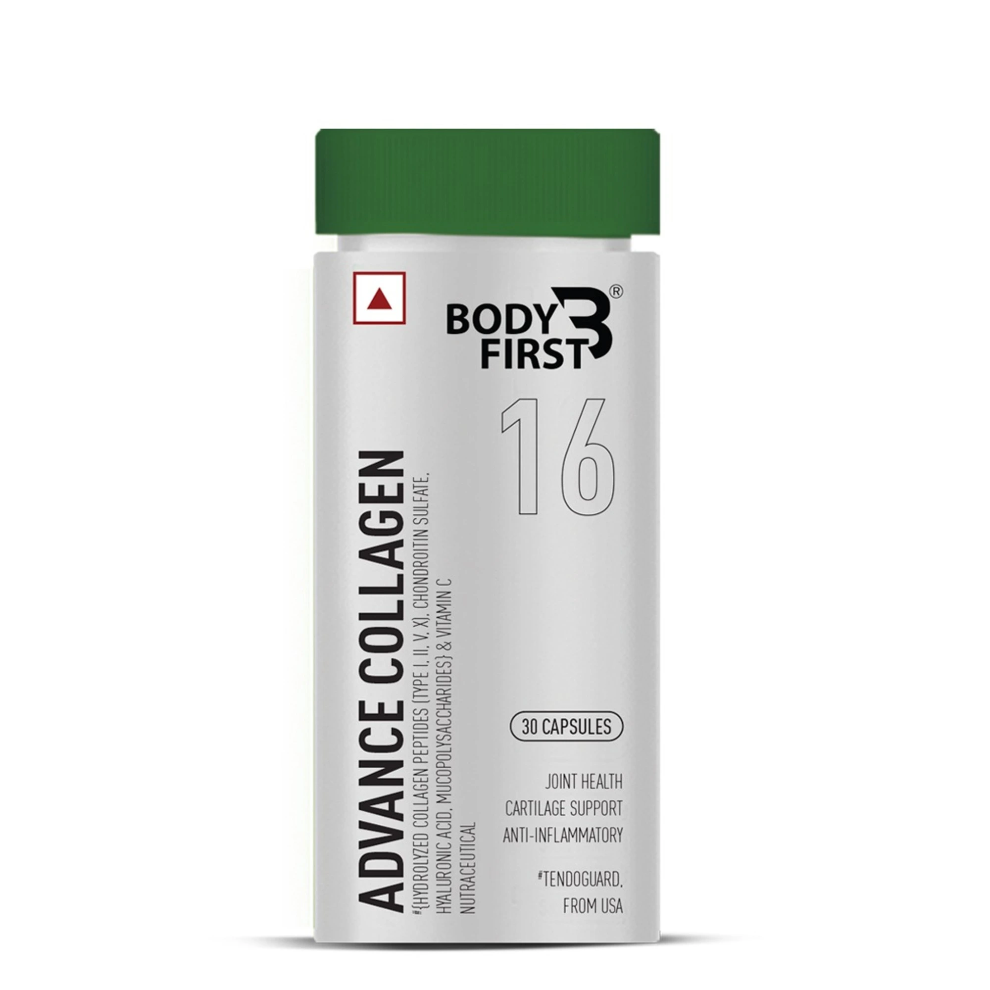 Ans : BodyFirst® Advance Collagen consist of Tendoguard {Hydrolyzed Collagen Peptides (Type I, II, V, X), Chondroitin Sulfate, Hyaluronic Acid, Mucopolysaccharides}, Vitamin C.