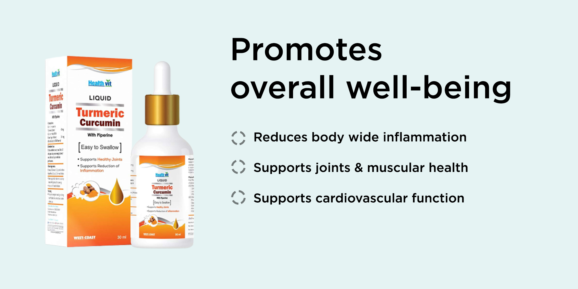 Turmeric drops support Healthy Joints and Reduction of Inflammation. Turmeric contains curcumin that helps to keep joint pain and swelling at bay. Due to its anti-inflammatory properties, it heals the pain quickly and assists you in leading a comfortable life. It is 100% safe to consume by anyone irrespective of age and gender.