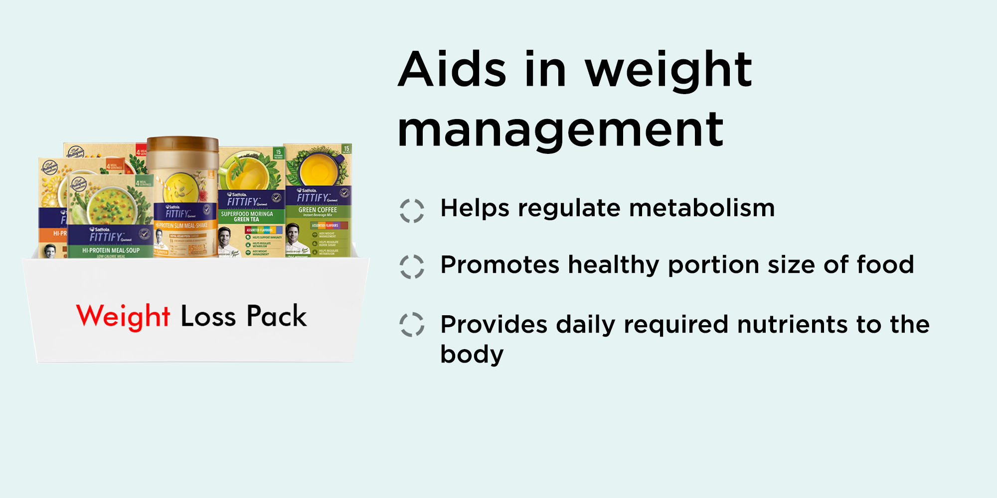 A single serve of the Hi-Protein Slim Meal-Shake provides 19-20g protein, 4-5g fiber and 26 vitamins and minerals per serving. A single serve also has vitamin C, vitamin E and iron in quantities that are equivalent to that found in 100g grapes, 10 almonds, and 1 cup of green veggies, respectively. This means that you get upto 50% of your recommended daily nutrition allowance with just a single serve of the Hi-Protein Slim Meal Shake. Also, you consume upto 70% less calories compared to an average Indian meal. This way Saffola FITTIFY Hi-Protein Slim Meal-Shakes can help you lose upto 4 Kgs in 2 months.