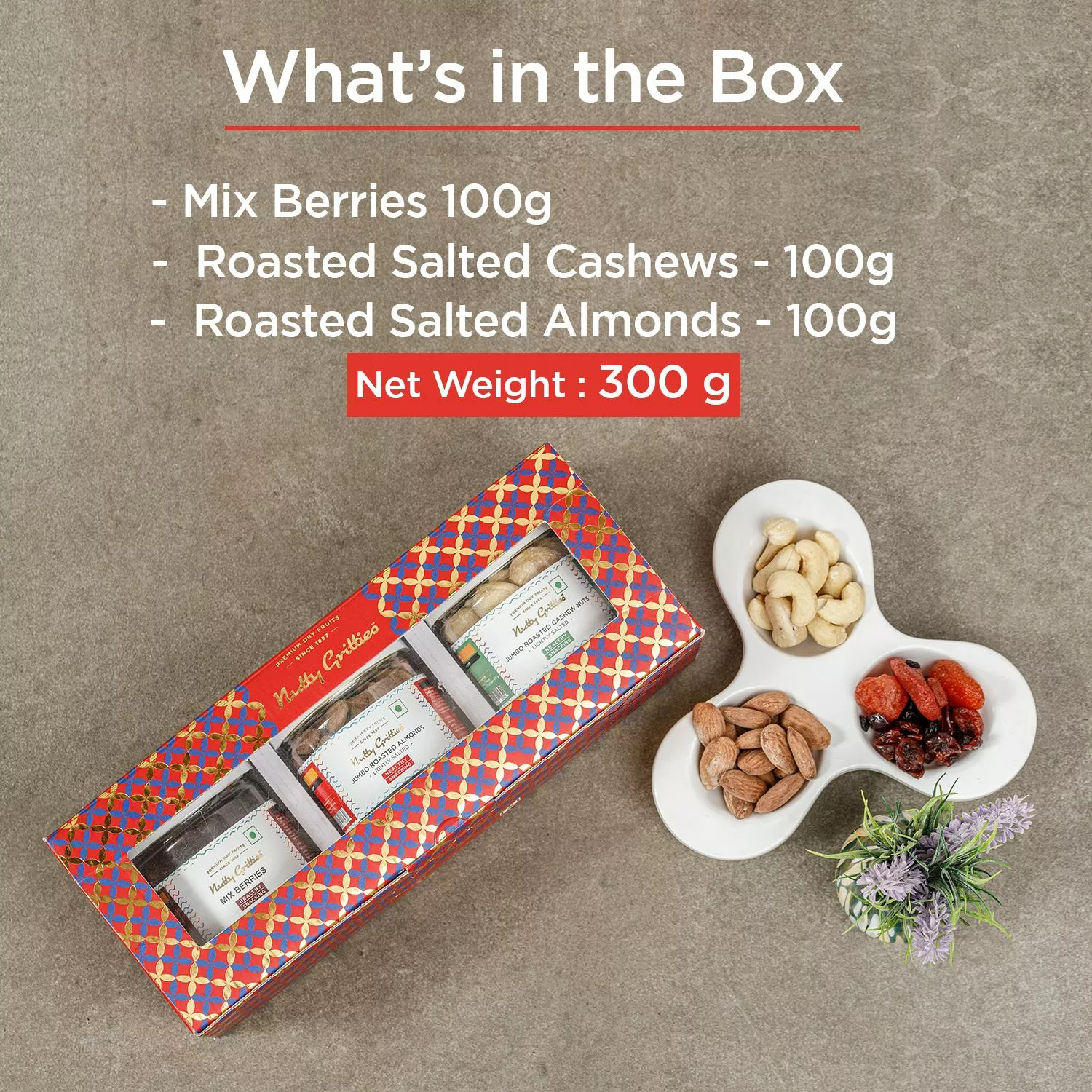 Nutty Gritties Variety Special 3 Jar Dry Fruits Gift Box - Mix Berries, Roasted Cashews & Almonds Combo - 300g (100gm Each)300gm