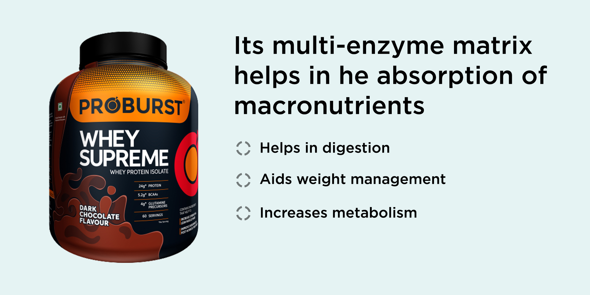 Each serving of Proburst Whey Supreme Dark Chocolate offers the goodness of: