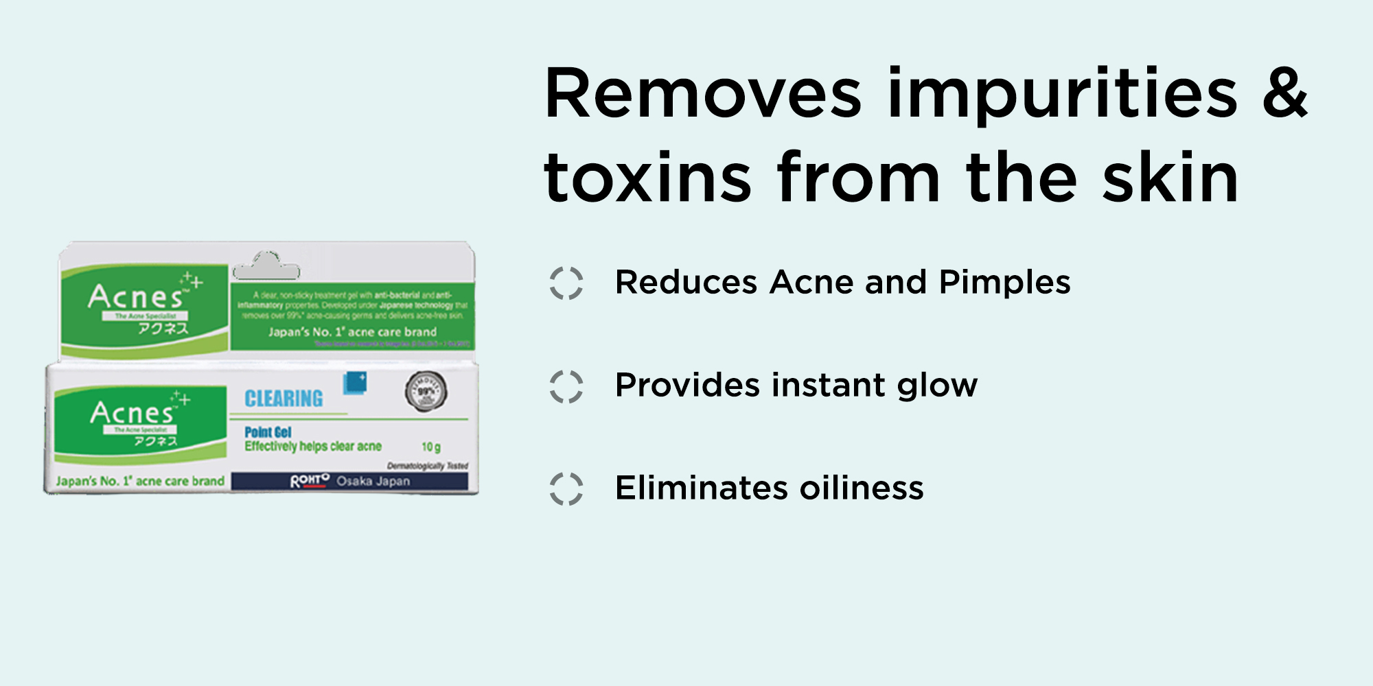 Acnes Clearing Point Gel is Japan's number 1 brand for acne care. Acne clearing point gel is made using Japanese technology. It is an ayurvedic remedy that contains concentrated extracts of herbs like white tea to cure acne fast.