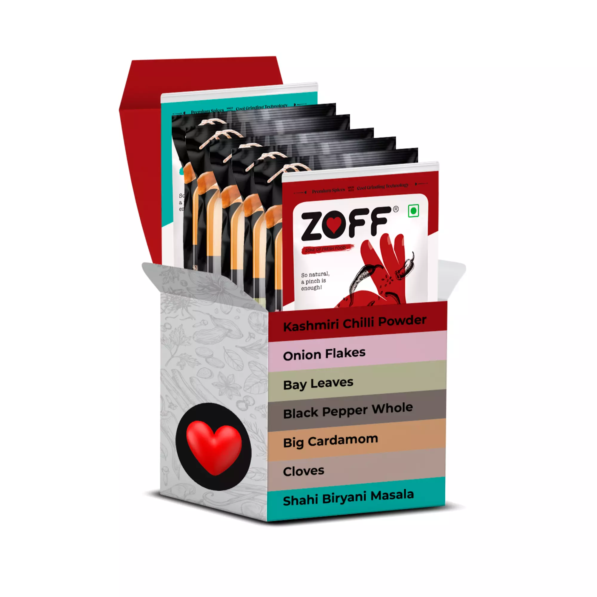 Biryani Masala 100 g, Big Cardamom 25 g, Cloves 25 g, Black Pepper whole 50 g, Bay Leaves 25 g, Kashmiri Chilli Powder 100 g, Onion Flakes 100 g.
